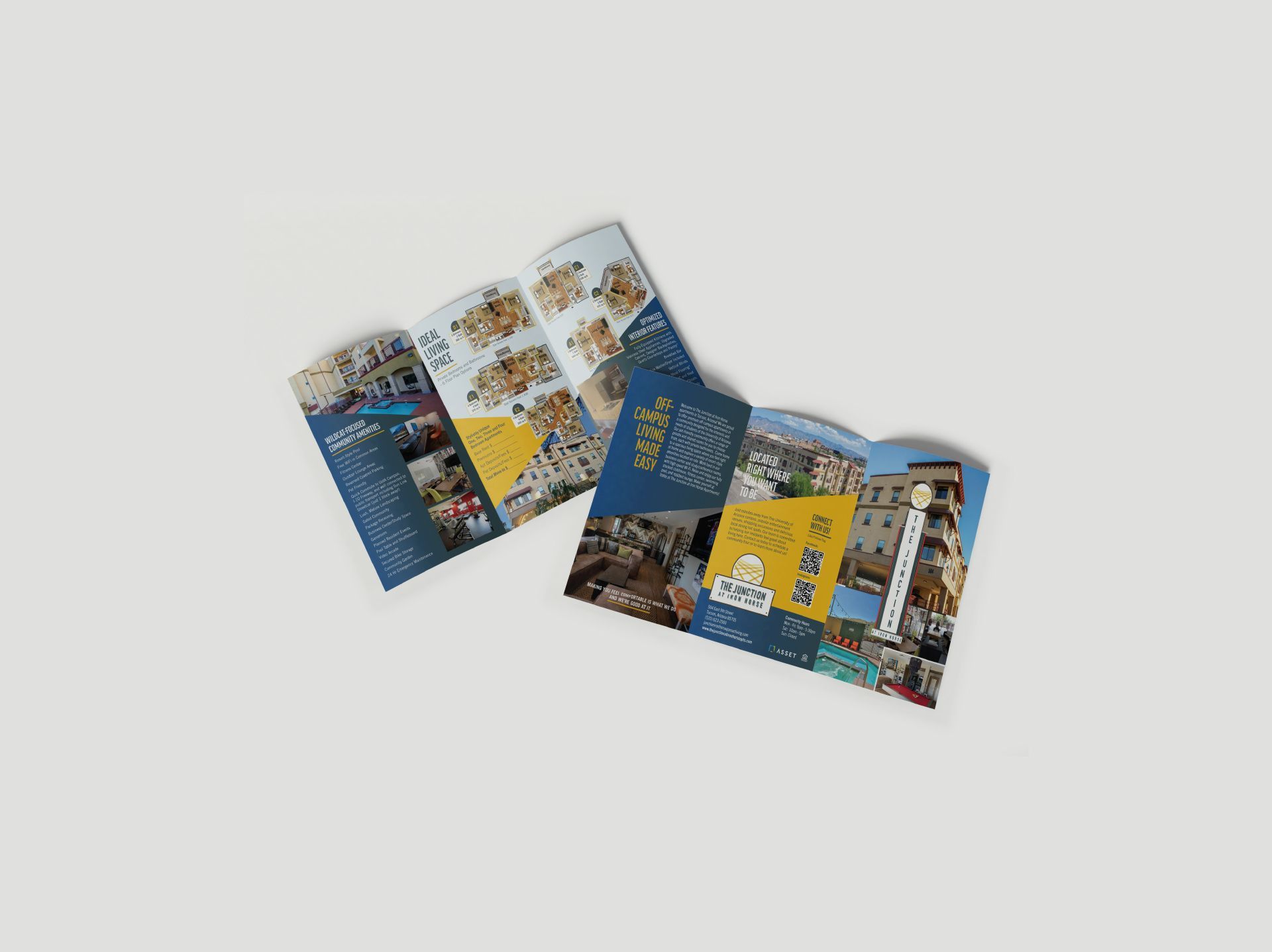 Designed print brochures tailored to distinct audiences and branding needs across multiple industries. Created a student-friendly brochure for The Junction at Ironhorse, using bold visuals, approachable language, and a youthful layout to appeal to the student housing market. Designed a direct marketing brochure for AlphaGraphics, focusing on clean, corporate design and clear messaging to effectively communicate services and drive client engagement. Developed a polished and modern brochure for The Viridian Apartments, showcasing the property’s upscale features through elegant typography, layout, and high-quality imagery. Each piece was crafted with attention to brand alignment, user experience, and print production standards.
